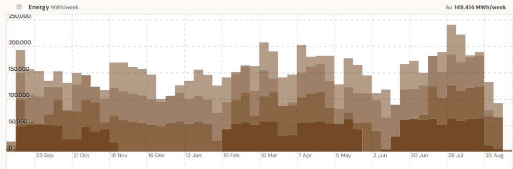 According to Open Electrcity, Yallourn averaged 149,414 MWh/week over the past year. Sounds solid, right? Until you look closer.