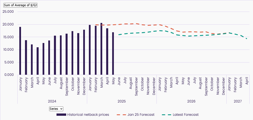 • LNG Netback Prices: prices have increased notably compared to 2024, rising from an annual average of $15.09/GJ in 2024 to a projected $17.63/GJ on average in 2025, a 16.8% YoY increase. However, within 2025, netback prices have declined from $19.94/GJ in January to $16.63/GJ by mid-April, reflecting a 17% drop over the quarter as global supply conditions eased and Asian spot LNG demand softened.