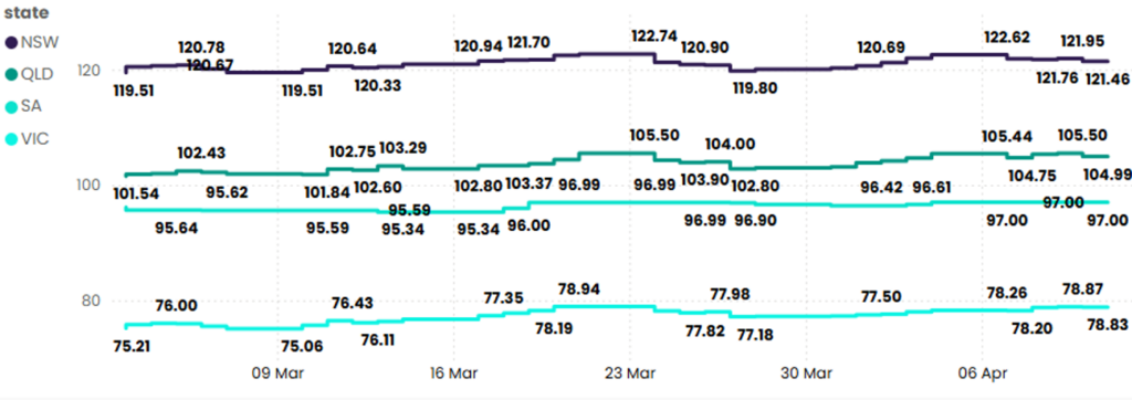 • Queensland: March’s electricity prices were influenced by Cyclone Alfred, which caused significant disruptions in early March. Prices rose from $101.54 to a peak of $105.50 on 24 March. After a brief decline, April experienced another surge due to unplanned outages, with prices stabilising towards the month’s end. Overall, Queensland recorded a 2.3% increase over the two-month period.