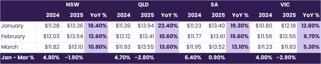 • Victoria: A more subdued 8.8% YoY increase was recorded, with prices moving from $11.19 to $12.18 across Q1. However, March delivered a sharp 5.8% MoM fall ($12.56 → $11.83) as softer end-of-summer demand and improved storage utilisation helped stabilise the market. Despite this near-term softness, structural supply challenges linked to Bass Strait declines and policy constraints remain a medium-term concern.