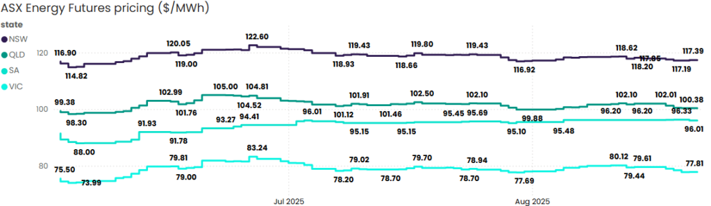 VIC futures dipped 0.2% to $77.81/MWh, but showed the highest price volatility of all NEM states, ranging from $77.75 to $80.12/MWh. Underlying demand declined 4%, while wind and solar performance supported grid conditions. Despite the dip, volatility remains a key consideration for Victorian businesses.