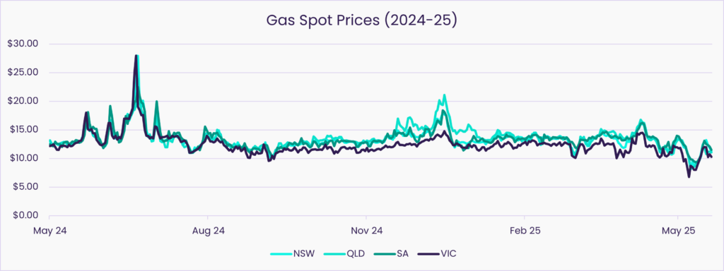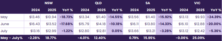 NSW prices dropped 3.9%, from $13.52/GJ to $12.99/GJ, following the cold snap in late June. July’s milder conditions helped moderate demand, though prices were only 1.2% below the same time last year, suggesting a more balanced winter overall.