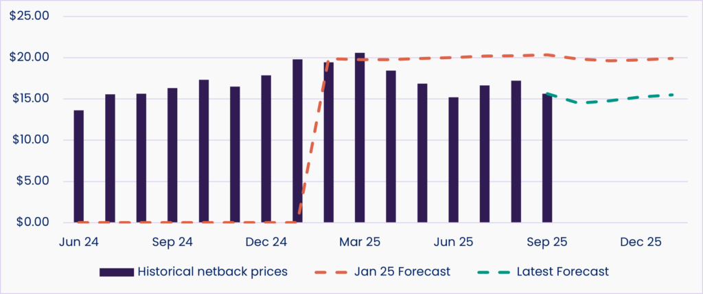 Netback prices continued their recovery in August, lifting from $16.64/GJ in July to $17.23/GJ, reversing some of the earlier softening observed in Q2. While the January 2025 forecast expected Q3–Q4 prices to remain above $20/GJ, the latest outlook has been revised downward slightly.