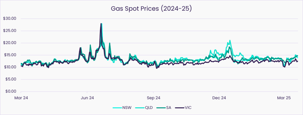 QLD’s gas market remained relatively stable in June, with spot prices averaging around $14.71/GJ. The state benefited from its proximity to gas production and LNG export facilities, which provided some insulation from the volatility experienced in southern markets. However, increased demand from southern states did lead to higher pipeline flows from QLD, highlighting the interconnected nature of the national gas market. - South Australia:
