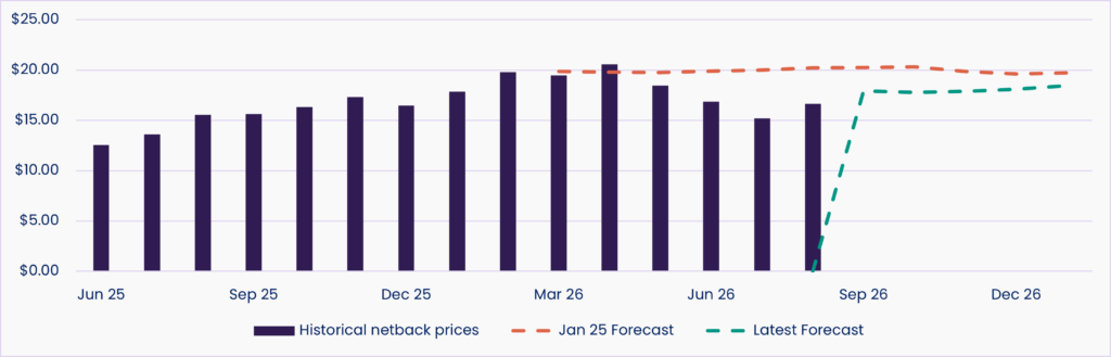 Netback prices rose 16.8% year-on-year, from a 2024 average of $15.09/GJ to a projected $17.63/GJ in 2025. Although they dropped 17% between January and mid-April (from $19.94 to $16.63/GJ) as global supply stabilised, forward expectations remain high — sitting between $19.70 and $20.30/GJ for Q3–Q4. This continues to place upward pressure on east coast contract pricing and adds complexity for large users navigating procurement in a tight domestic market.