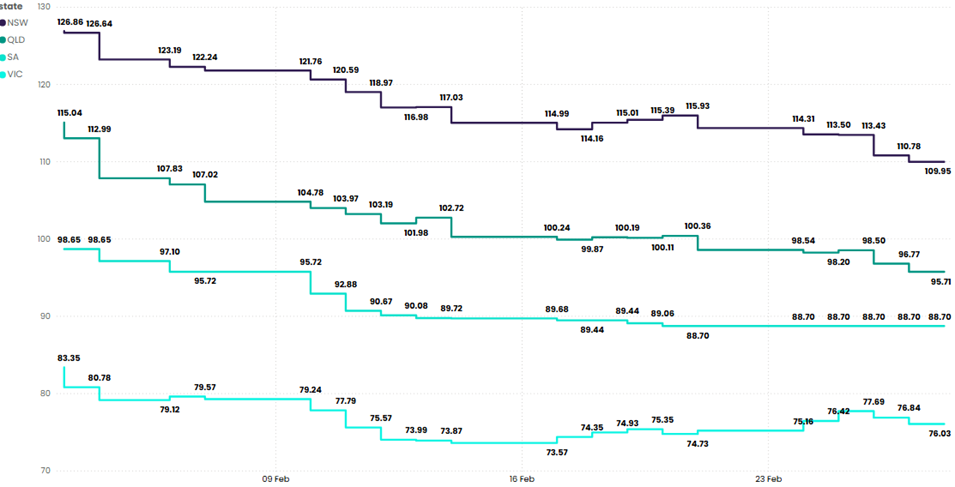February and early March saw continued fluctuations in electricity futures prices across the National Electricity Market (NEM), with notable reductions in most states and sustained trends in negative pricing events, particularly in high-renewable regions.